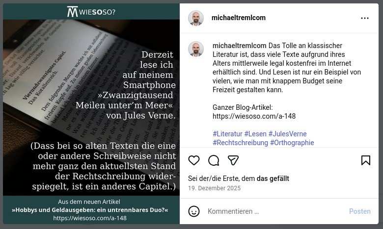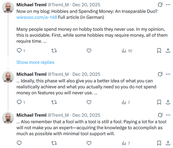 Auf meinen Social-Media-Kanälen, wo ich Links zu meinen monatlichen Artikeln teile, sieht diese Kalkulation dagegen desaströs aus. Das ist laufender Aufwand mit einer Wirksamkeit nahe dem absoluten Nullpunkt.